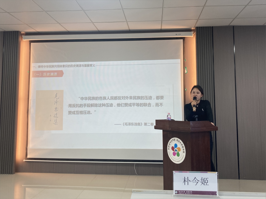 会上,朴今姬老师从铸牢中华民族共同体意识的历史溯源和重要意义、延边铸牢中华民族共同体意识的实践探索、延边铸牢中华民族共同体意识的现实启示等方面为全院教师进行了一场深入浅出、生动透彻的专题讲座。