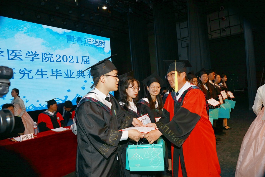 皮肤病与性病学专业博士研究生金玟言、临床专业本科生徐源振作为学生代表发言。他们表达了自己对恩师的感激之情,对父母多年支持的感恩,对这几年在延边大学的生活的怀念和不舍,以及自己在学习过程中的成长与心得。作为延医人,做好自己的工作,坚守自己的职业操守,怀揣仁义之心,是必不可少的。他们表示,不论时间如何改变,都会坚守初心,一直在医学路上走下去。
