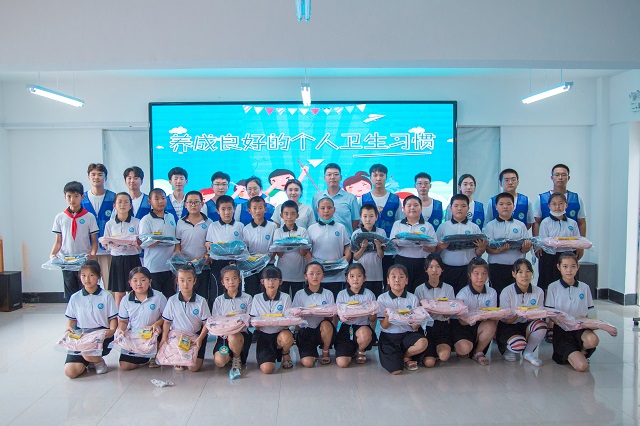 和药学院的团委老师将准备好的纪念品亲手送到小朋友们的手中。