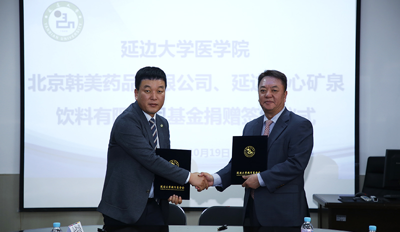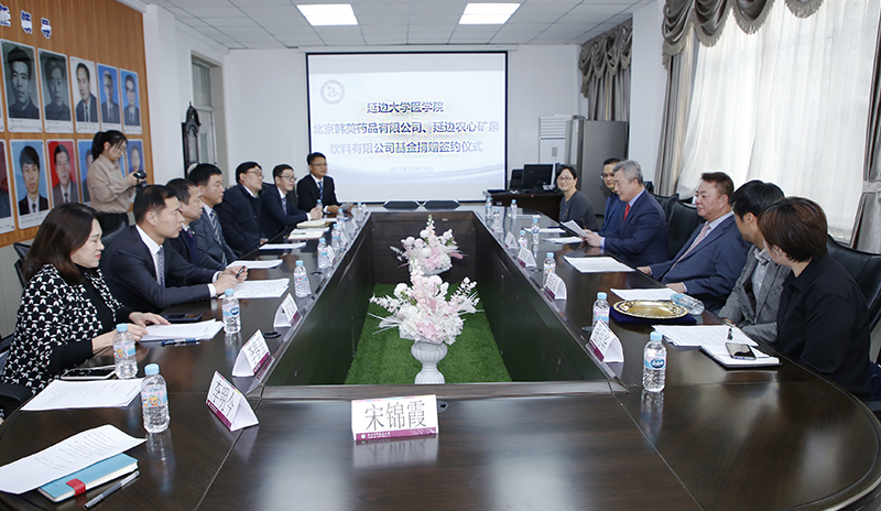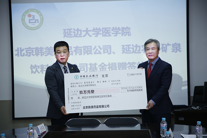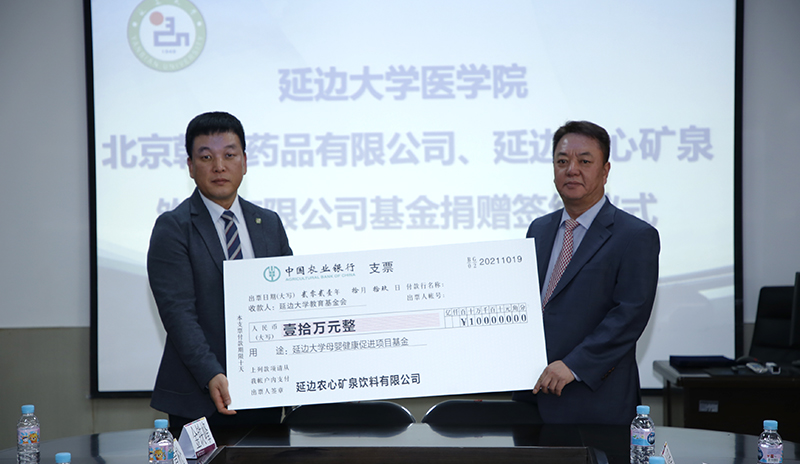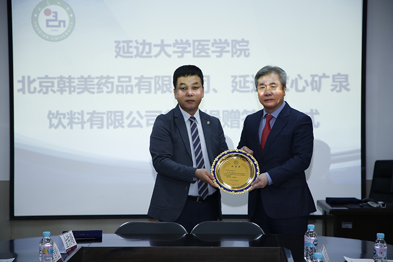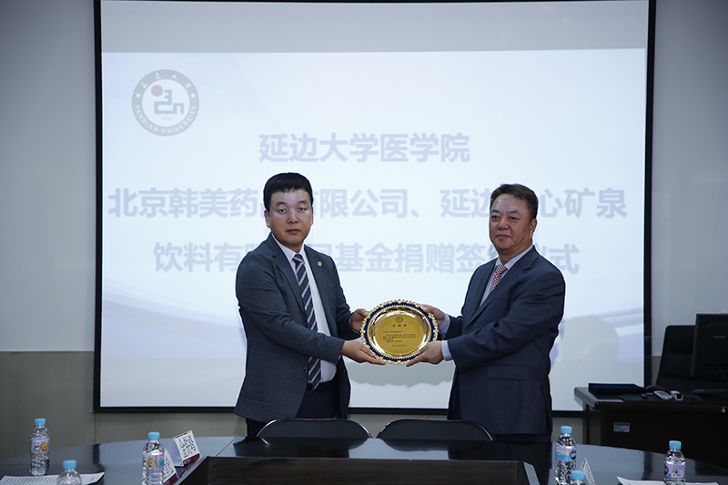 北京韩美药品有限公司任海龙总经理、延边农心矿泉饮料有限公司安明植董事长与金钟范秘书长签署捐赠协议;北京韩美药品有限公司向延边大学捐赠玖万元人民币,延边农心矿泉饮料有限公司向延边大学捐赠拾万元人民币,为“延边大学母婴健康促进项目”推进给予了支持,金钟范秘书长代表学校接受捐赠,并向任海龙总经理、安明植董事长颁发感谢牌。